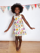 This versatile a-line dress for kids features a gorgeous, detailed print. It's made of high quality, easy to care for cotton, is super comfortable, and layers beautifully for wear in different seasons.