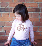 Red Thread's bicycle tee is a favourite! This soft pink cotton tee is silkscreened with a simple, geometric bicycle in rich warm brown. This long-sleeved tee is cut small, so please order one size up (size 6 is like a 4-5).