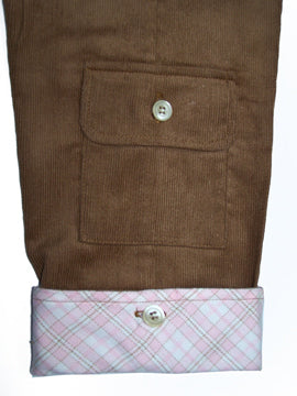 These rich caramel corduroy pants feature a contrast button-up cuff in soft pink plaid and cute low side pockets. With an adjustable waistband (using buttonhole elastic) and cuffs that look great turned up or then down, as your child grows, these are cute, versatile, and sure to fit for a long time. Enjoy!