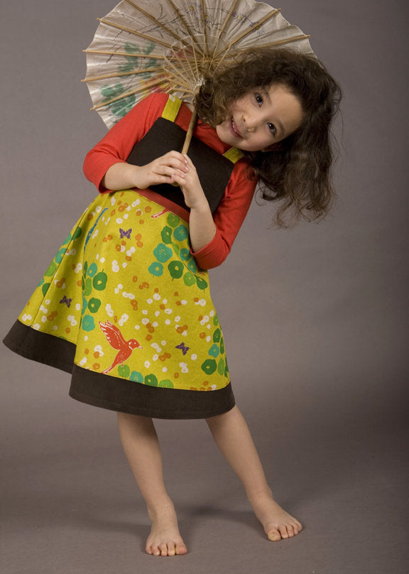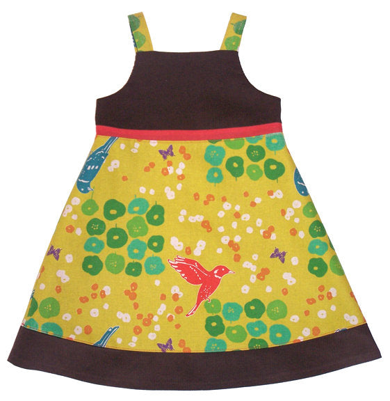 This gorgeous fall/winter/spring dress features a blend of cozy chocolate brown corduroy paired with a stunning Japanese print in a vibrant chartreuse accented by red and blue birds. This versatile dress layers beautifully and is sure to stand out in the crowd.