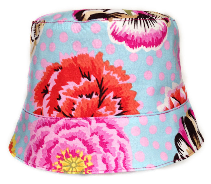 This fun summer hat features a vibrant large-scale floral print. It’s 100% cotton, reversible to a beautiful hot pink (just trim the label inside), works well with the brim up or down, and looks great with a variety of colours.