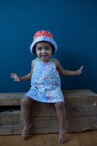 This cheeky summer hat features a cute retro print in gorgeous colours. It’s 100% cotton, reversible to a solid purple (just trim the label inside), works well with the brim up or down, and looks great with a coordinating dress or a variety of colours.