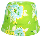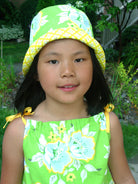 This cheerful summer hat in a classic cloche style features a happy green floral print on the outside, and a vibrant yellow contrast print on the inside. It’s 100% cotton, reversible (just cut off the label inside), and looks great with a coordinating dress or a variety of colours.