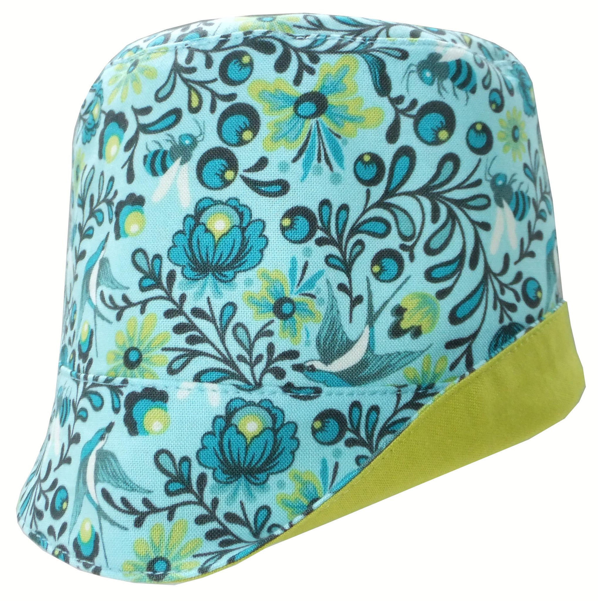 This sweet summer hat features a jumble of delicate foliage in which there are little blue birds and bees hiding - it's fun to search for them! It’s 100% cotton, reversible to a solid lime green (just trim the label inside), works well with the brim up or down, and looks great with a coordinating dress or a variety of colours.