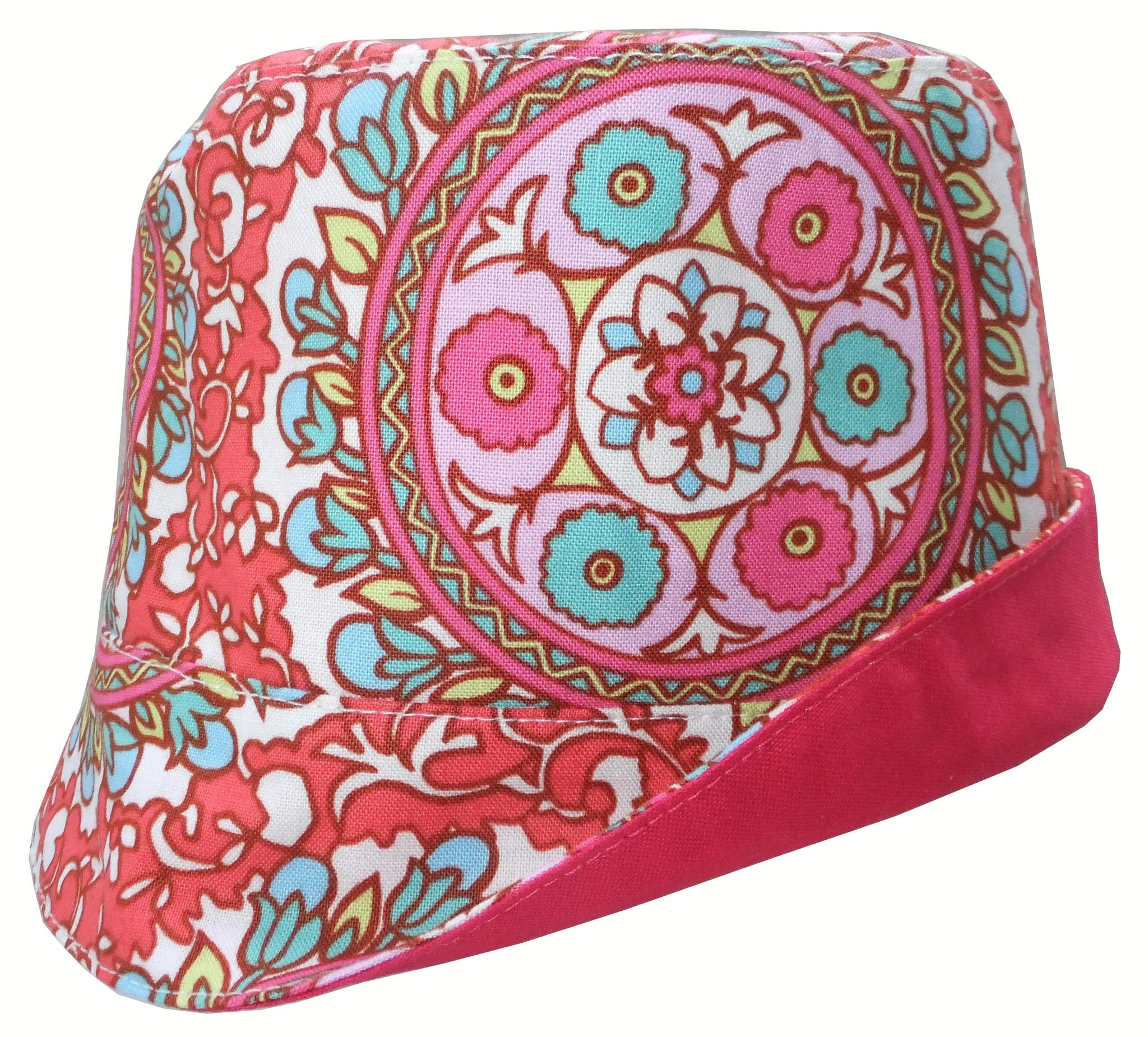 This vibrant summer hat features an ornate floral medallion print, like a beautiful mosaic. It’s 100% cotton, reversible to a solid hot pink (just trim the label inside), works well with the brim up or down, and looks great with a coordinating dress or a variety of colours.
