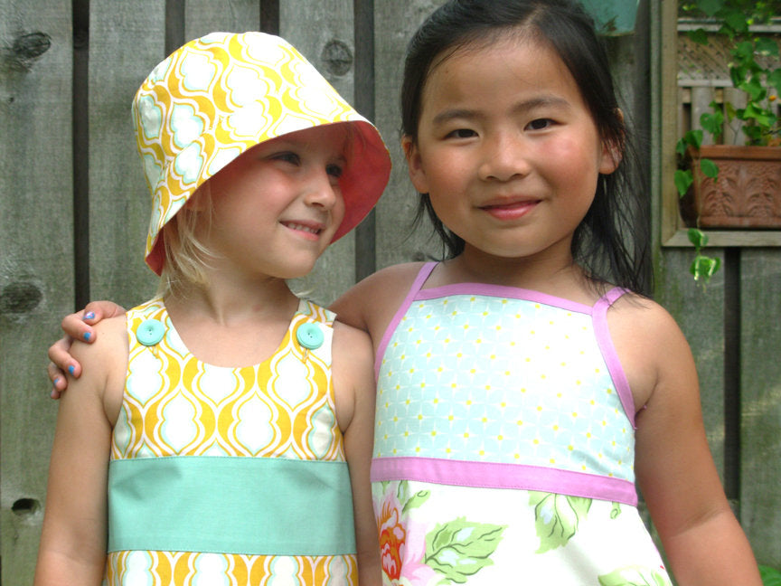 The pattern on this lovely medium-scale print makes me think of vintage tablecloths, cheerful cottage quilts, and juicy summer fruits.This sweet summer hat features lovely warm tangerine colour on a curvy geometric print, with peachy pink or soft teal on the reverse. So light, fresh and summery. It’s 100% cotton, reversible (just cut off the label inside), and looks great with a coordinating dress or a variety of colours.