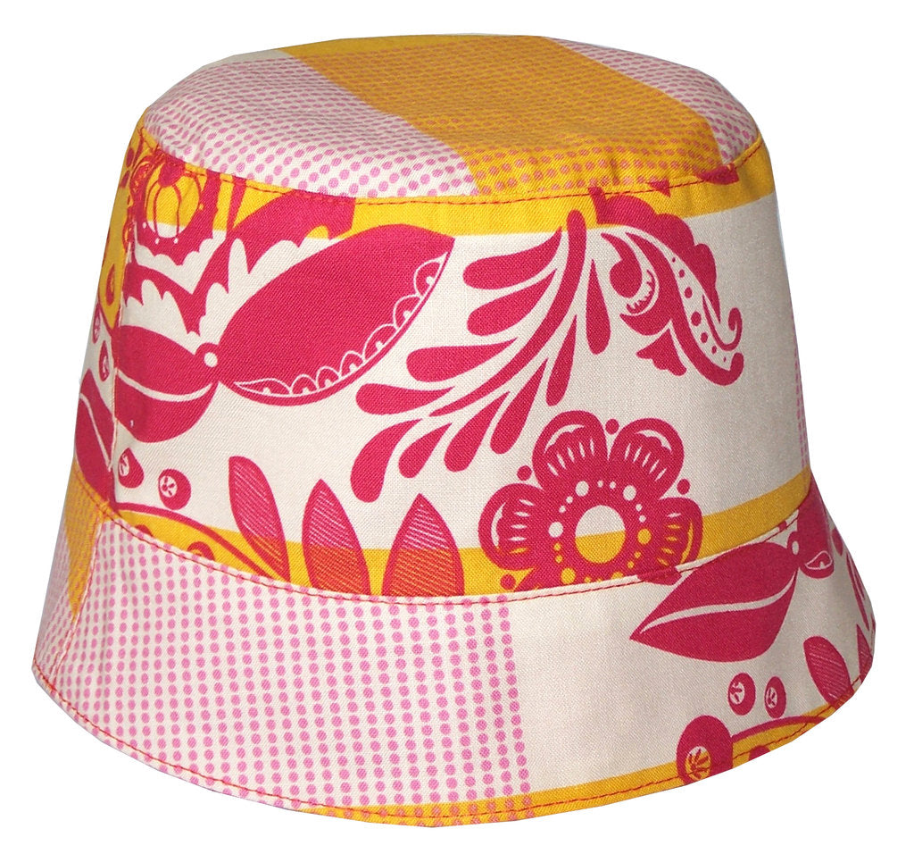 This vibrant summer hat in a classic cloche style features a gorgeous print on one side, and a vibrant solid red on the other. It’s 100% cotton, reversible (just cut off the label inside), and looks great with a coordinating dress or a variety of colours.