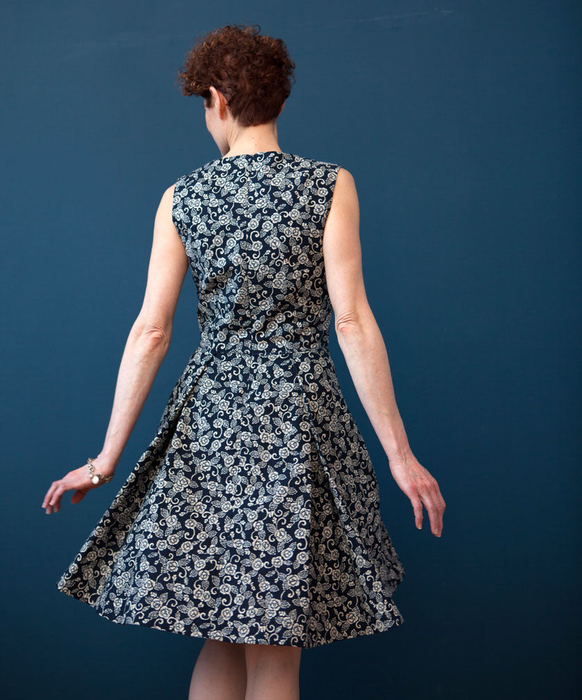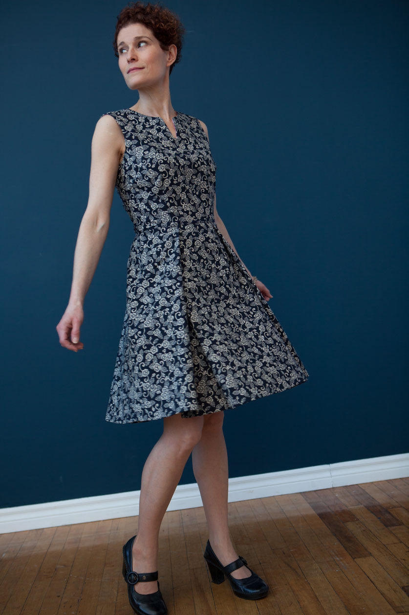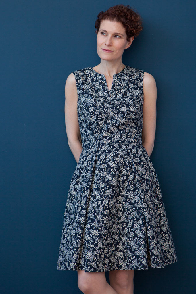 Red Thread's Mariko Dress has a fitted bodice, retro styling, a skirt with overlapping pleats, and generous side pockets. Made from a gorgeous medium-weight indigo printed cotton from Japan, the Mariko Dress is comfortable, stylish and elegant (and perfect year-round).