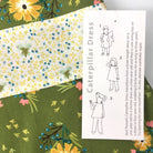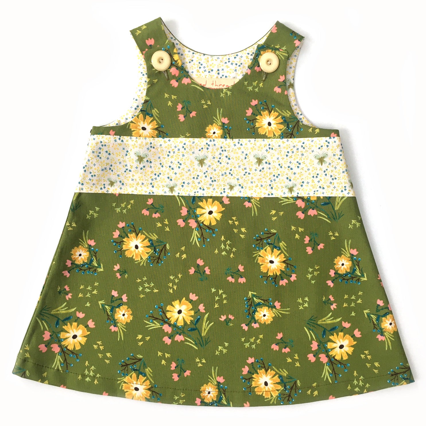 This caterpillar dress features a gorgeous green background with tiny bird tracks, little flowers and berries, and tiny butterflies. It has lovely vintage buttons and looks terrific with a variety of colours.