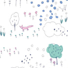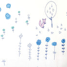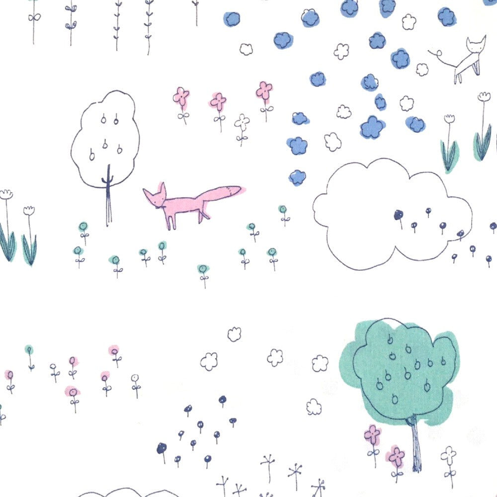 Megumi Sakakibara is a Japanese illustrator known for her lovely, playful line drawings for children. This fabric is a gorgeous lightweight bright white cotton (a quilting cotton, but on the lighter side), covered with playful designs with cats, foxes, deer, rabbits, and other little creatures playing among the flowers. It was made in Japan and has a lovely crisp elegance. To give you an idea of scale, the green trees are 2.5" high (including the trunk) and the rabbits are about 1" long/tall.