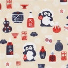 This fun fabric features images of Tanuki (Japanese raccoon dogs, a symbol of good luck), sake bottles, and lanterns.