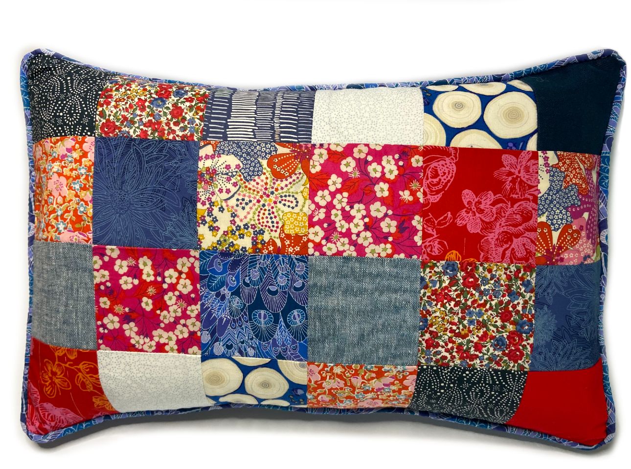 This handmade patchwork pillow (12" x 18") is one-of-a-kind, pieced from lovely fabrics including cottons, vintage, and Liberty fabrics. There's an overlapping envelope back to hold an easily removable pillow. A feather and down pillow is included.