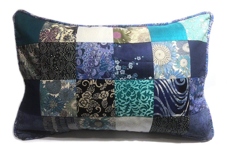 This handmade patchwork pillow (12" x 18") is one-of-a-kind, pieced from lovely fabrics including cottons, vintage, and Liberty fabrics. There's an overlapping envelope back to hold an easily removable pillow. A feather and down pillow is included. This one is piped with a vibrant blue Liberty fabric.