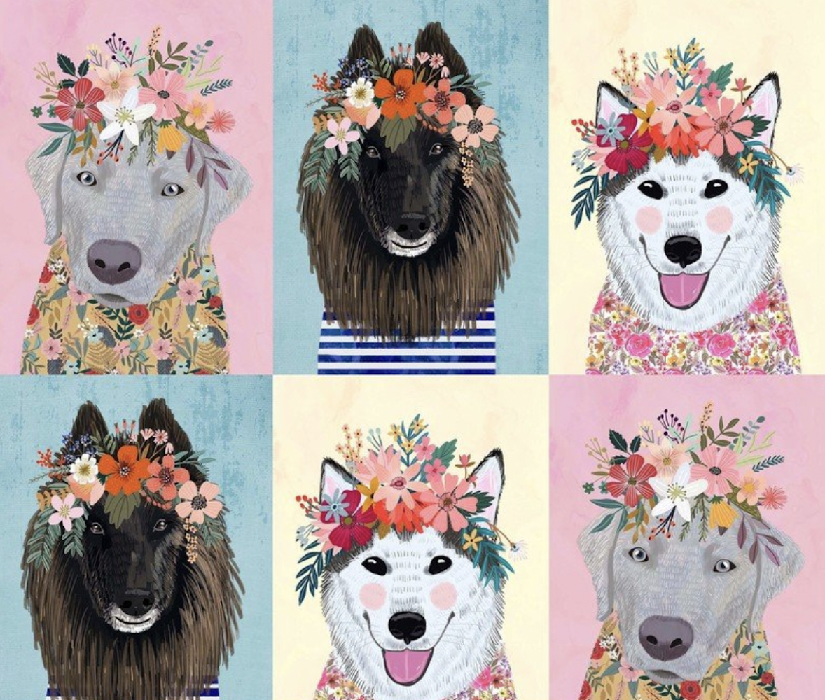 This adorable panel is from the "Floral Pets" collection by Mia Charro for Blend Fabrics. The whole fabric is gridded, and the full width of the fabric is ten "panels" wide, with the 3 adorable dogs seen in the image repeated. I'm selling this fabric by the unit: one unit of this fabric is 12" high and 44" wide (WOF) - see below.