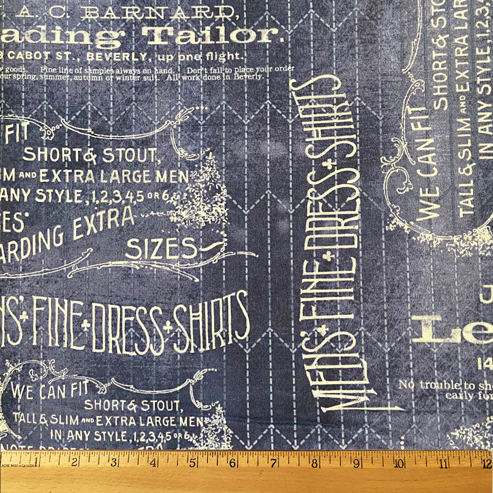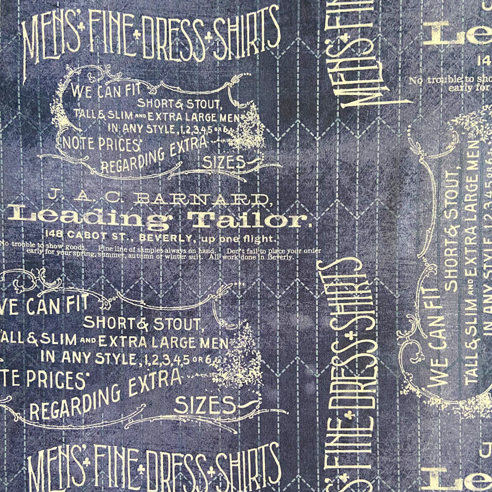 Designer Tim Holtz is known for his vintage aesthetic; this line of fabric is called Eclectic Elements. This wonderful print is a gorgeous indigo blue and is covered with vintage ads for J.A.C. Barnnard, "Leading Tailor."