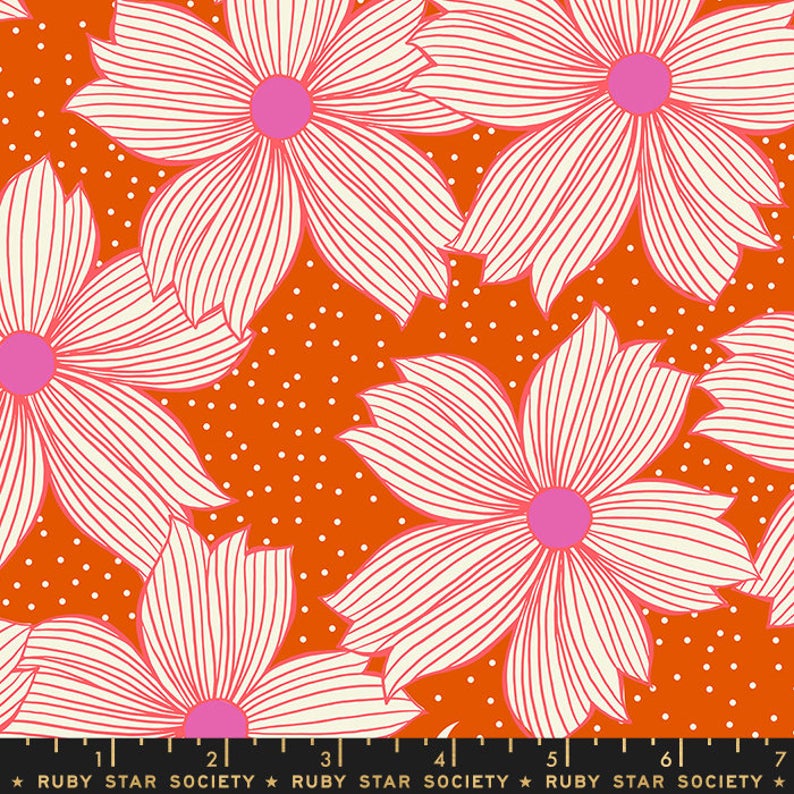 This gorgeous floral print is simple and versatile, in a beautiful shade of orange with fuschia highlights. This fabric is by Sarah Watts for Moda's Ruby Star Society.