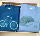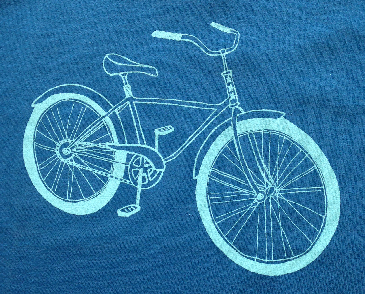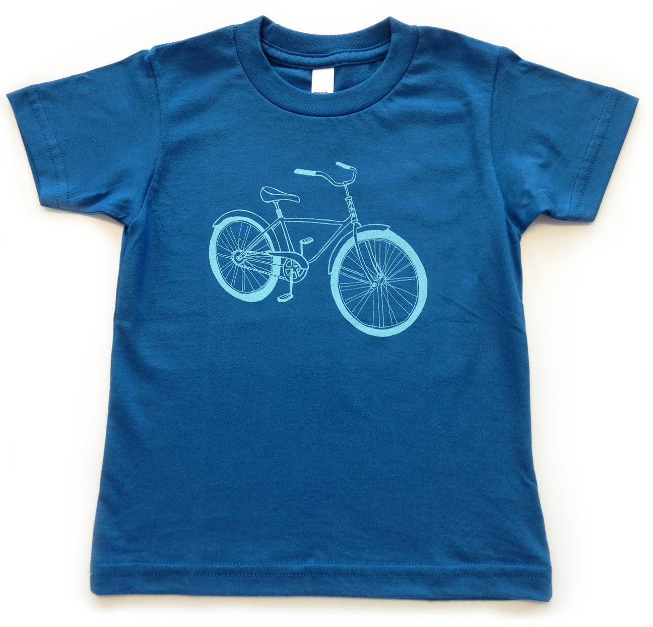 This new design is a rich teal blue organic cotton tee, silkscreened with a lovely hand-drawn bicycle. A great shirt for boys or girls, this supersoft tee is available from sizes 2 to 12 years.