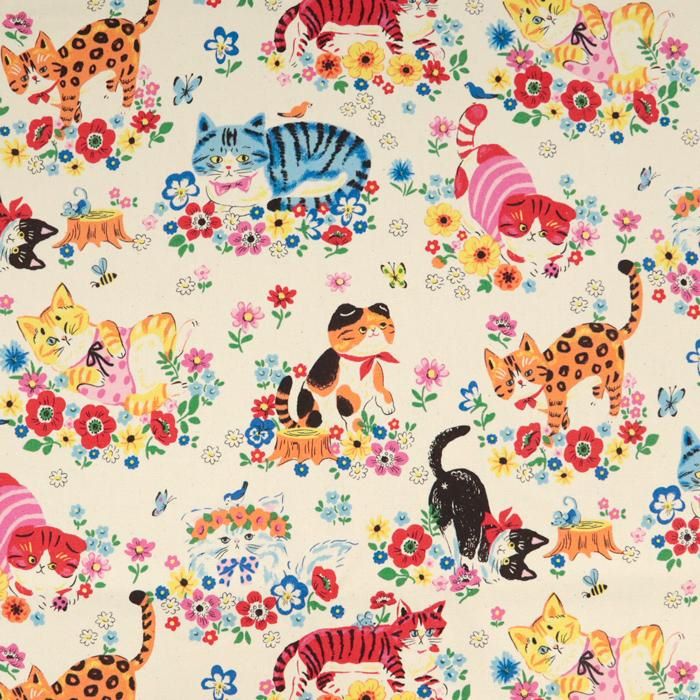 Powerful Animal "Flower Cats" COTTON TWILL, KOKKA Japan