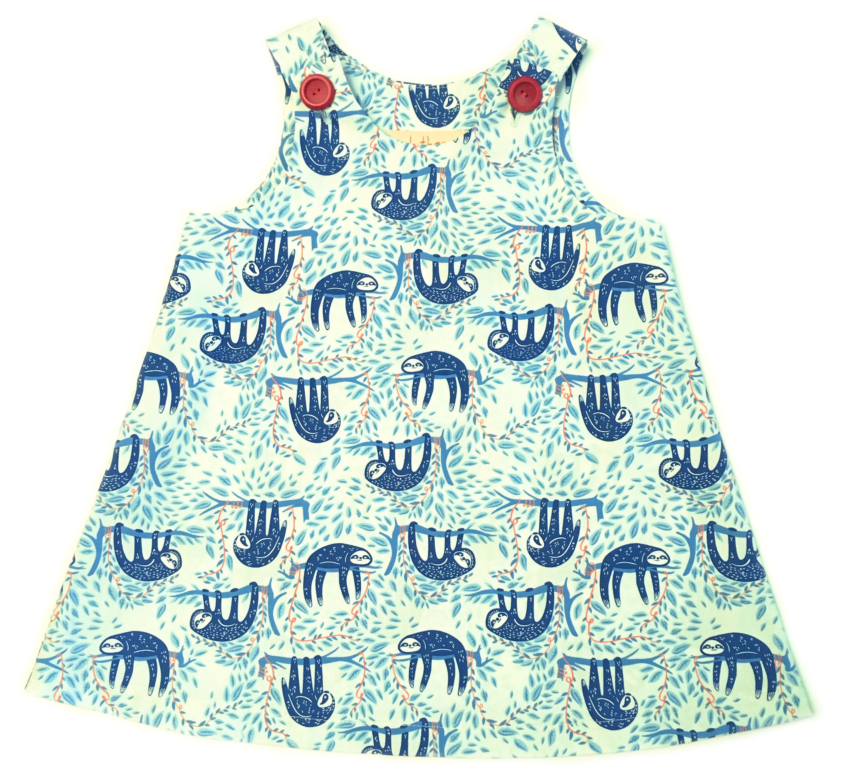 This sweet Caterpillar Dress features adorable blue sloths. It has a lovely colour scheme of blues with fine tendrils of reddish pink and chunky red buttons.