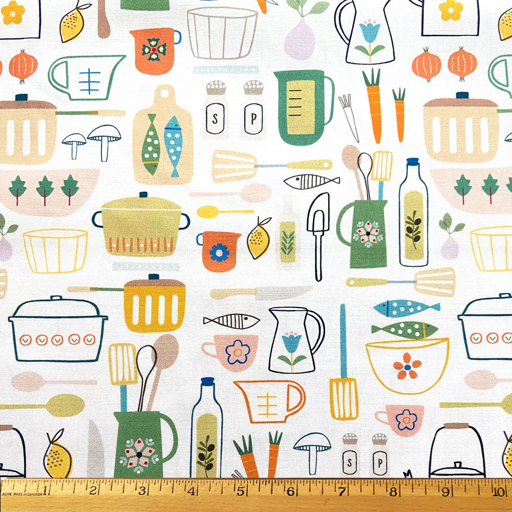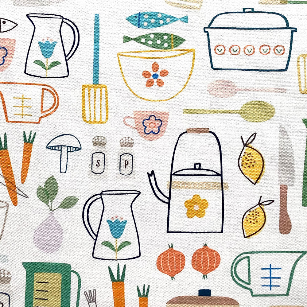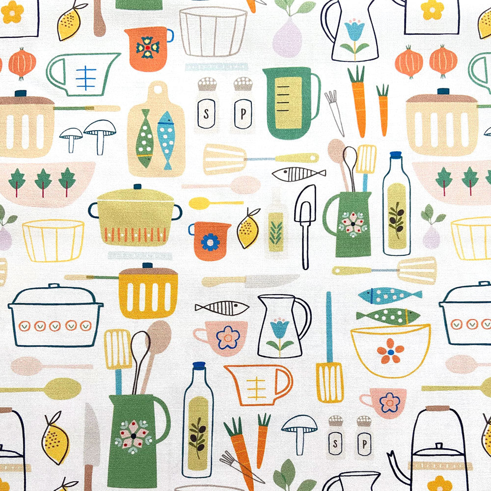 This gorgeous retro print features an abundance of retro kitchen tools. Part of the "Hobbies" collection by Sally Payne for Dashwood Studio, the crisp white background and soft retro colours would look great in so many kinds of projects.