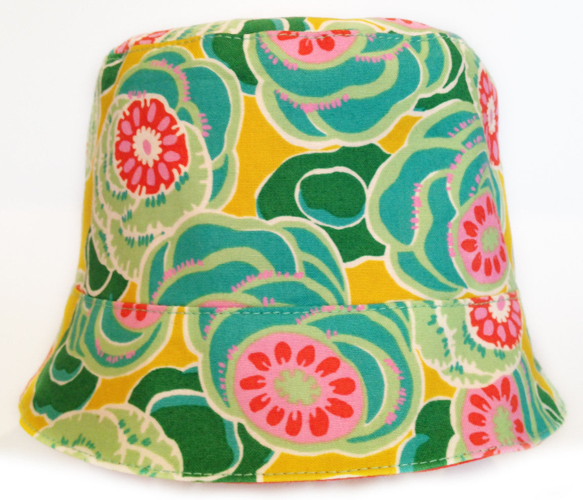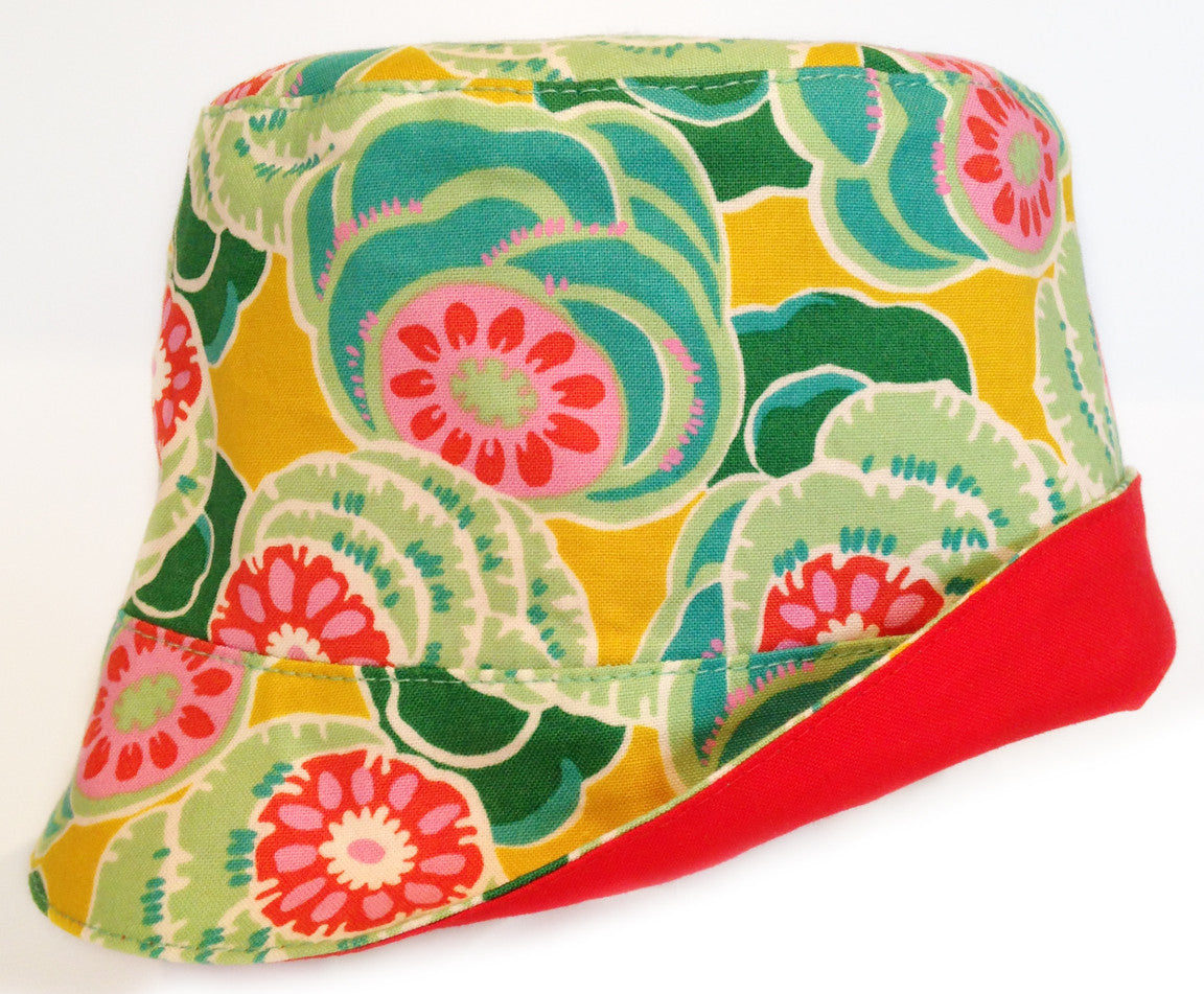 This beautiful summer hat features a rich Amy Butler print, reversible to solid red (just trim the label inside). It’s 100% cotton, works well with the brim up or down, and looks great with a coordinating dress or a variety of colours.
