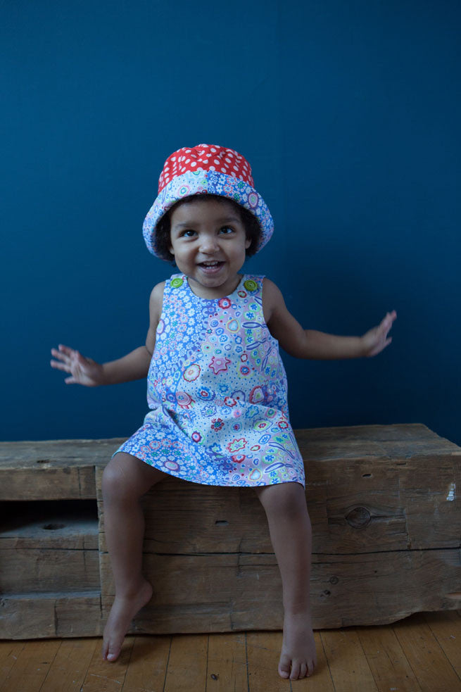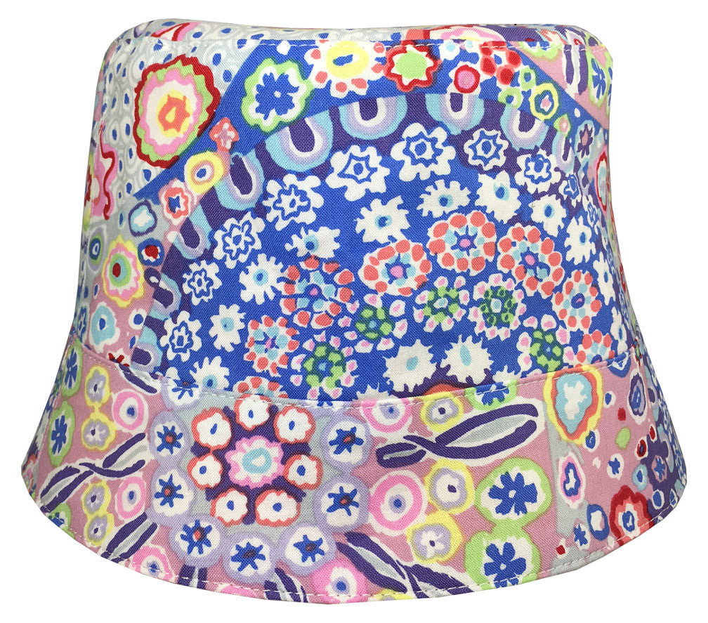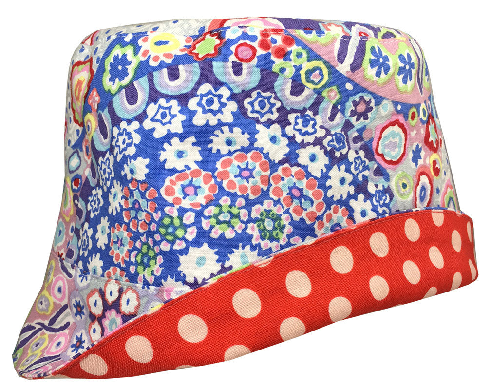 This beautiful summer hat features a lovely retro-coloured print that looks like piles of millefiori glass beads, from designer Kaffe Fassett. It’s 100% cotton, reversible to a red polka dot print (just trim the label inside), works well with the brim up or down, and looks great with a coordinating dress or a variety of colours.