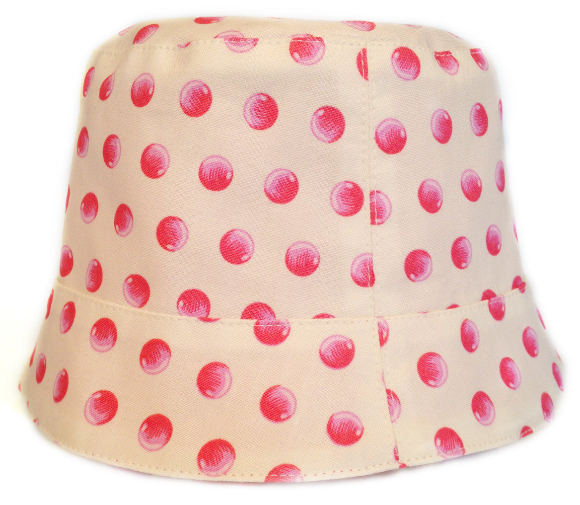 This fun summer hat features lovely bubblegum-pink dots, reversible to a vibrant solid pink (just trim the label inside). It’s 100% cotton, works well with the brim up or down, and looks great with a variety of colours.