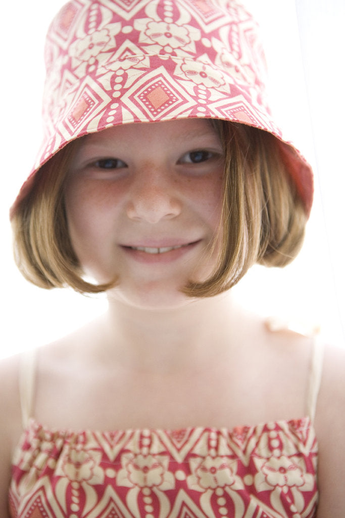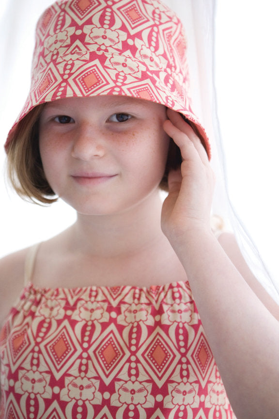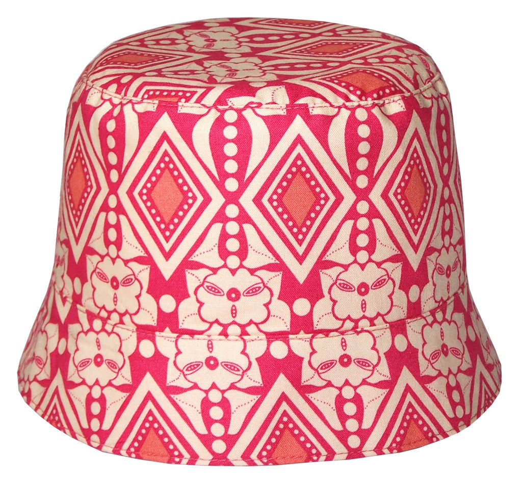 This pretty summer hat in a classic cloche style features a gorgeous geometric print on one side, and a lovely salmon pink on the other. It’s 100% cotton, reversible (just cut off the label inside), and looks great with a coordinating dress or a variety of colours.