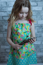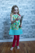 This sundress features a beautiful, unusual floral print from fabric designer Amy Butler, highlighted by a gorgeous turquoise at the hem, and bright red cotton ribbon shoulder ties. Perfect as a dress or bathing suit cover-up, over leggings or capris, as a top, or over a top, this super-versatile, comfortable dress lasts for a really long time, transitioning from dress to top. The ribbon ties are sewn down in the centre for safety, but fully adjustable as your child grows. It’s a perfect gift, because it fits a wide variety of sizes.