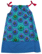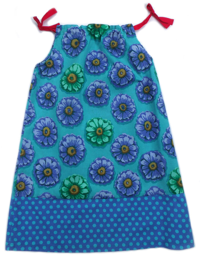 This sundress features a vibrant aqua floral print highlighted by a contrasting polka dot band at the hem, and Japanese cotton ribbon shoulder ties (that stay tied, and are soft for comfort). Perfect as a dress or bathing suit cover-up, over leggings or capris, as a top, or over a top, this super-versatile, comfortable dress lasts for a really long time, transitioning from dress to top. The ribbon ties are sewn down in the centre for safety, but fully adjustable as your child grows. It’s a perfect gift, because it fits a wide variety of sizes.