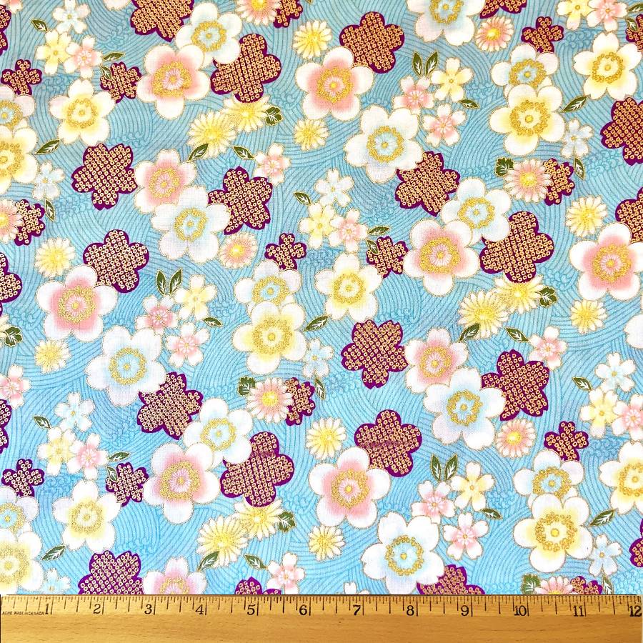 Sevenberry is a wonderful collection of Japanese fabrics. The Sakura Brook Metallic Collection features traditional Japanese florals in gorgeous rich colour with gold metallic accents.