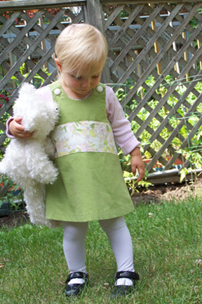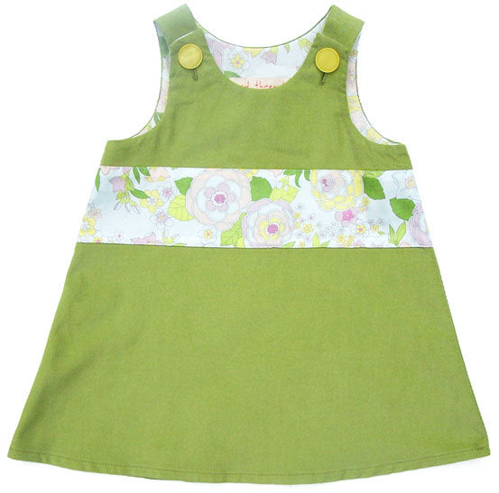 Back by popular demand, this lovely Caterpillar Dress features a mossy shade of green in supersoft baby corduroy, highlighted with a clean white retro floral band. Beautiful layered over white or soft yellow, this is great choice for people who prefer a softer look and a non-traditional palette.