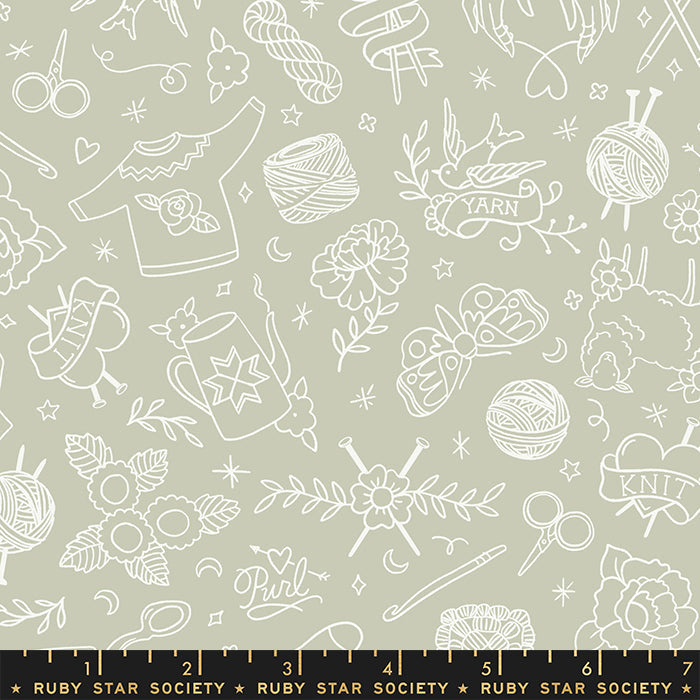 This lovely print is part of the Purl collection by Sarah Watts for Moda's Ruby Star Society. The Purl collection is Sarah Watts' love note to yarn. Dandelions, rayon flowers and birds, balls of yarn, as well as llamas, tea kettles and hands knitting in red, pink, blue, orange, green, teal, black and navy.
